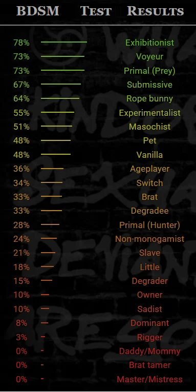 One thing is sure, I love to entertain my viewers in many ways. I’m a free sprit who is willing to try new things. As is shown in my BDSM test, I’m an experimentalist.